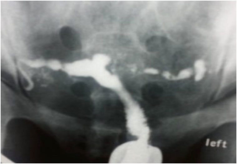 - 6-11 ден от менструалния цикъл при тънък ендометриум визуализира цервикалния канал, матката, тръбите, хидросалпингси, фимоза, перитонеално разливане на контраста.